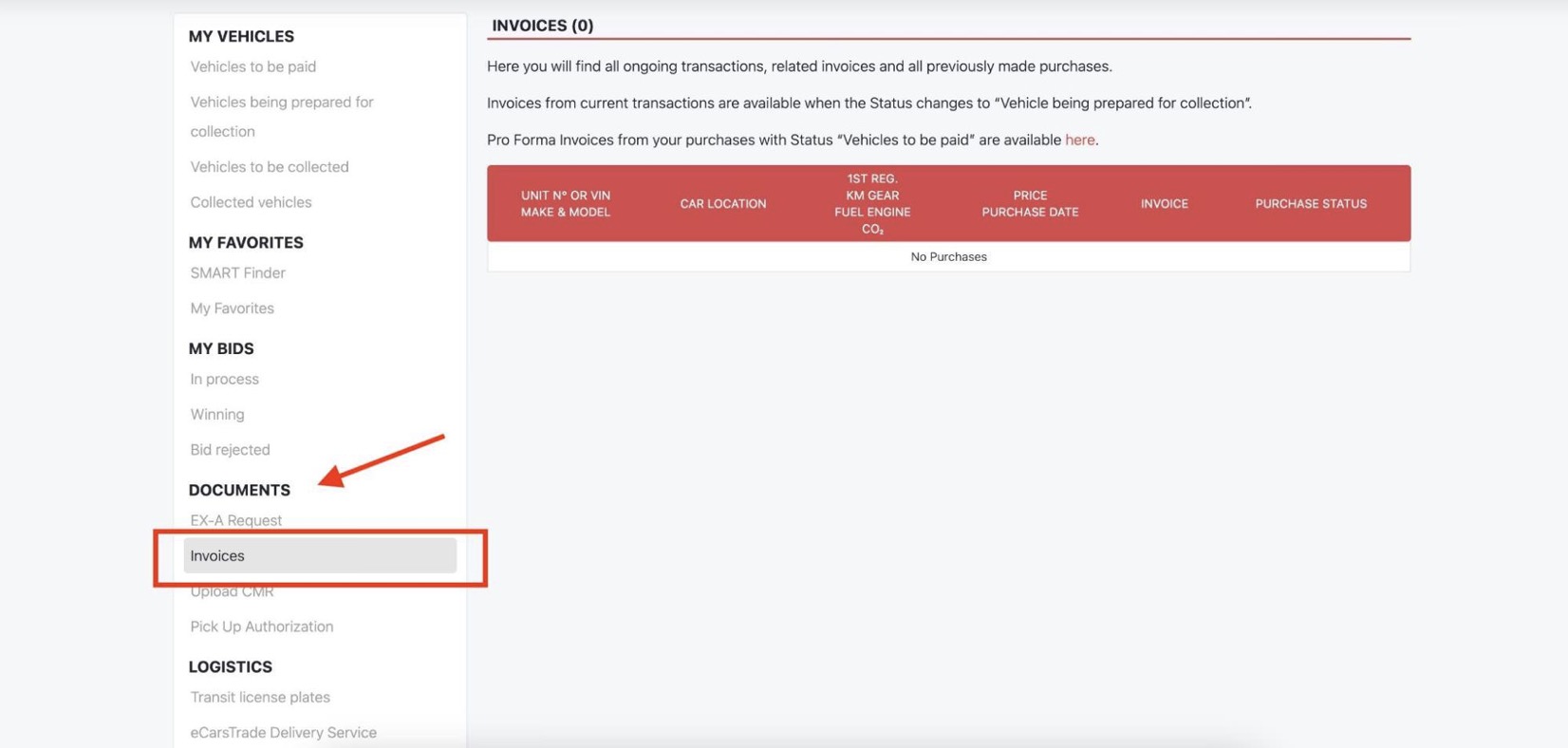 Eğer aracınızı eCarsTrade üzerinden satın aldıysanız, faturanızı Kişisel Sayfanızdan alabilirsiniz.